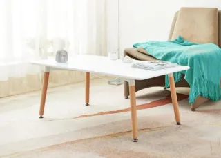 Elegante mesa de centro con superficie blanca y patas de madera. - Diseño moderno y minimalista. - Patas cónicas de madera clara. - Bordes redondeados para mayor seguridad. - Envíos a toda Galicia 🚚 - Pago contra reembolso 💲 REF:M-108-C