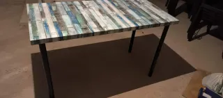 Mesa con un diseño de tablones de madera en tonos azules y blancos. Sus patas son ajustables para mayor comodidad. - Diseño de tablones de madera. - Patas ajustables. - 4 Unidades, 30€ unidad