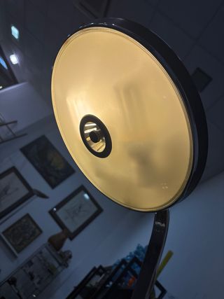 Elegante lámpara de mesa con un diseño mítico y sofisticado. 1960 - Base redonda y brillante. - Brazo curvo y estilizado. - Pantalla ovalada en acabado negro.