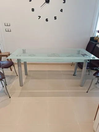 Vendo mesa de comedor de cristal. Medidas: 1.80 largo x 90 ancho x 75.5 alto. Está en muy buen estado, pero una de las patas tiene algo de oxido en la parte de abajo (aparece en las fotos). Precio: 210€ También vendo un conjunto de 6 sillas de color granate. Tienen evidentes signos de uso y desgaste, pero todavía están bien para seguir aprovechando. Precio: 60€ las 6. Precio conjunto mesa comedor + 6 sillas: 250€.