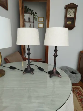 Elegante pareja de lámparas de mesa con un diseño clásico. En perfecto estado. - Pantallas de tela en tono beige. - Bases y soportes de metal con acabado en bronce.