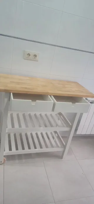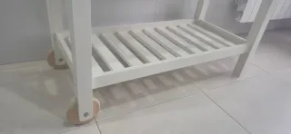 Práctica mesa auxiliar para cocina con superficie de madera y estructura blanca. - Diseño moderno y funcional. - Ruedas para fácil movilidad.