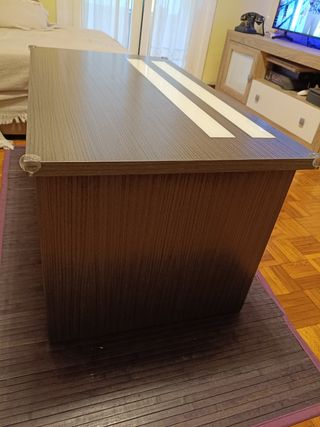 Mesa de centro robusta (te puedes sentar ). Aglomerado duro.Tiene un par de muescas casi imperceptibles. Se abre(62cm de alto abierta),ideal para comidas o trabajo.Solo venta en persona.