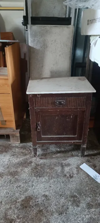 Mesilla auxiliar de estilo antiguo con un elegante mesado de mármol. - Encimera de mármol. - Estructura de madera. - Cajón con tirador metálico. - Puerta con cerradura. - Patas robustas.