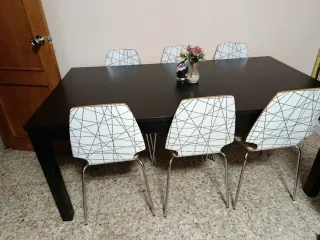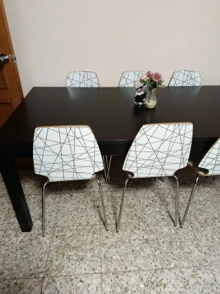Conjunto de mesa de comedor con seis sillas. - Mesa con superficie negra. - Sillas con diseño moderno y patas metálicas. Venta en persona, no se hace envíos.