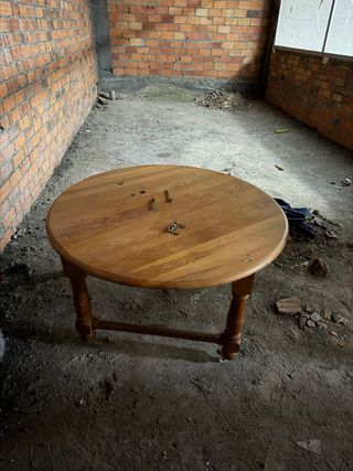 Mesa redonda de madera con un diseño clásico. Esta in poco sucia pero esta en super buen estado. Negociable Tiene ruedas - Patas torneadas. - Tablero con vetas marcadas.