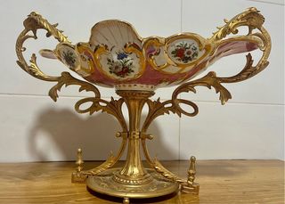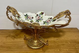 Antiguo centro de mesa con base de bronce y cuenco de porcelana con motivos florales. En buen estado. Medidas: 40 x 24 x 12 cm el cuenco (sin los agarres laterales) 15,5 cm de base 25,5 cm de alto desde el cuenco hasta la base.