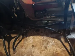 Conjunto de mesa y máquina de coser antigua de la marca Sigma. Un mueble clásico con un diseño atemporal. - Máquina de coser Sigma con detalles en verde. - Mesa de madera con estructura metálica. - Pedal de pie para accionar la máquina.