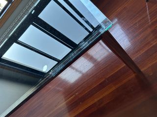 Elegante mesa de centro para tu salón, combinando materiales de calidad. Precio original 1557,07€ (adjunto foto recibo) - Diseño moderno con sobre de cristal. - Base robusta de madera. - Medidas cristal 140x65cm - Grosor cristal 1,5cm