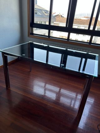 Elegante mesa con superficie de cristal y estructura metálica. - Diseño moderno y versátil. - Patas metálicas resistentes.