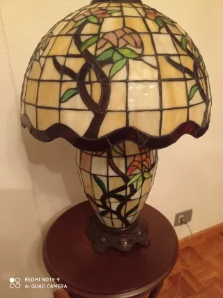 Elegante lámpara de mesa con un diseño inspirado en el estilo Tiffany. Su pantalla está elaborada con piezas de cristal de colores que forman un bonito patrón floral y ramas. - Pantalla de cristal con diseño floral. - Base de metal. - Tonos beige y multicolor.
