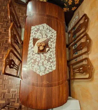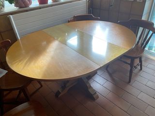 Conjunto de mesa redonda de madera con un diseño clásico y cinco sillas a juego. - Mesa de 112 cms, extensible a 150. - Cinco sillas, medidas: Asiento 43x43 80 alto. A recoger en Llanera hasta el 15 de enero