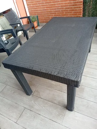 Mesa de exterior con un diseño moderno y elegante, perfecta para disfrutar de tus espacios al aire libre. - Dimensiones: 160 cm de largo, 90 cm de ancho y 75 cm de alto. - Superficie superior de cristal. - Estructura de rattan - color gris antracita Se entrega con las patas desmontadas