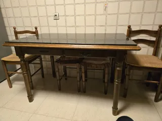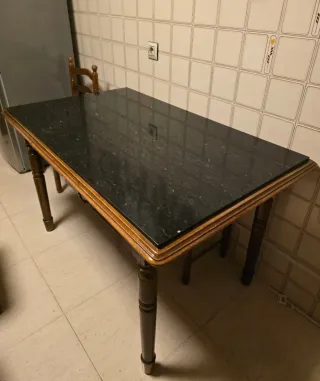 Mesa de cocina con un diseño elegante y funcional. Posibilidad de llevar también 3 sillas y 2 taburetes aparte que aparecen en la foto y en mi perfil. - Tapa de piedra de granito. - Estructura de madera oscura.