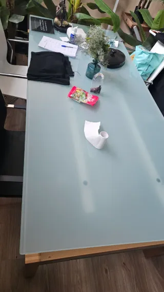 Mesa de madera cerezo con cristal doble templado sin estrenar.