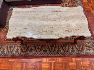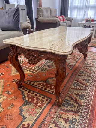 Mesa de centro clásica de gran calidad Fabricada en madera maciza tallada, con patas curvas y refinados detalles ornamentales. Sobre de piedra natural de mármol en tono crema, con vetas naturales y acabado trabajado. Mesa sólida, pesada y muy estable, pensada para durar toda la vida. Aporta carácter y elegancia a cualquier salón de estilo clásico, rústico o ecléctico. Medidas: Largo 120 cm · Ancho 60 cm · Alto 50 cm Muy buen estado. Recogida en mano en Oviedo. Se vende por cambio de decoración.