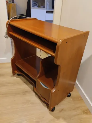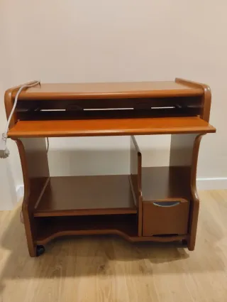 Mesa de ordenador con un diseño funcional y elegante. - Acabado en tono madera natural. - Estructura robusta y estable. - Bandeja extraíble para teclado. - Bandeja inferior extraíble. - Compartimento de almacenamiento para CDs extraible - Ruedas para fácil movilidad. - Toma de corriente debajo de la mesa.