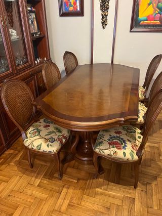 Conjunto de mesa de comedor con seis sillas a juego, ideal para tu hogar. - Mesa de madera con diseño clásico. - Seis sillas de madera con asientos tapizados.