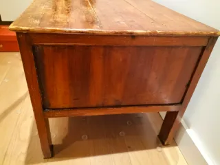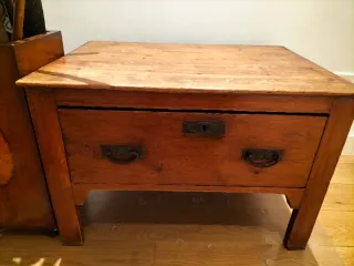 Mesa auxiliar de madera con un práctico cajón. Medidas 71,5 ancho x47,5 alto x 51 profundo. Cajón 58 ancho x 19,5 alto x 48 profundo. - Diseño rústico y funcional. - Tiradores originales. - Ideal como mesita de noche o auxiliar.