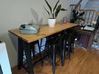 Mesa alta con un diseño moderno y funcional. Estilo industrial. - Tablero de lamina de roble con vetas visibles. - Patas y estructura de madera