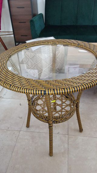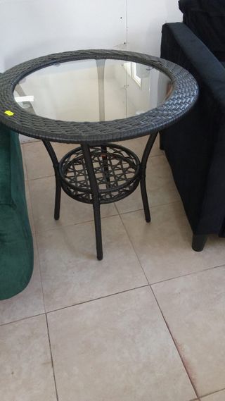 NUEVO,elegante mesa auxiliar con un diseño moderno y atractivo. Perfecta para añadir un toque de estilo a cualquier espacio, viene de color negro y dorado. Puedes comunicarte al 601530970. DISFRUTA DE NUESTRO PRECIO ESPECIAL, SI COMPRAS AL POR MAYOR. - Tablero redondo de cristal. - Estructura de mimbre trenzado. - Base con diseño de rejilla.