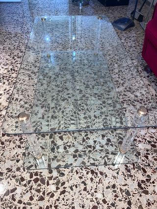 Elegante mesa de centro con estructura metálica dorada y dos superficies de cristal (una arriba y otra abajo). - Diseño moderno y sofisticado. - Patas con detalle de bambú. Los cristales están en perfecto estado. Aparecen en la foto embalados. Cristales color armado marrón.