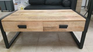 NUEVO,mesa de centro con un diseño rústico que combina madera y metal, puedes comunicarte al 601530970. DISFRUTA DE NUESTRO PRECIO ESPECIAL, SI COMPRAS AL POR MAYOR. - Encimera de madera con acabado natural. - Patas y estructura de metal negro.