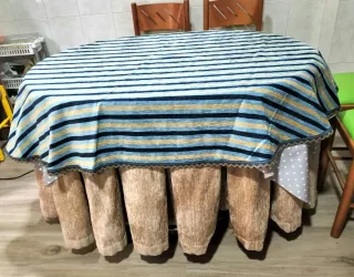 Tapete para mesa ovalada con un diseño de rayas en tonos azules y beige. El borde tiene un detalle decorativo. - Diseño de rayas verticales y horizontales. - Borde con acabado festoneado. - Colores: azul claro, beige y azul oscuro. Tejido grueso tipo faldilla. Medidas 180x 147 cm. Elaborado por tienda de decoración y cortinas. Apenas usado. Cómo nuevo.