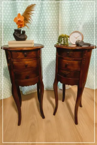 Rebaja de precio del 10% aconsejada por Wallapop aplicada. Conjunto de dos mesitas de noche de estilo clásico. Perfectas para añadir un toque elegante a tu dormitorio. - Diseño curvo y patas estilizadas. - 3 cajones con tiradores discretos. - Detalles tallados en los laterales. - Recién restauradas. Se encuentran en Puerto Real.