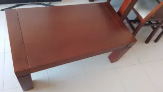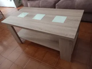 Conjunto de dos mesas. Una de centro y una pequeña de esquina con un diseño moderno. La mesa grande se abate y se abre para poder guardar cosas dentro,tiene algunas marcas de uso en la superficie. La pequeña está perfecta. Son de buena madera no es conglomerado.