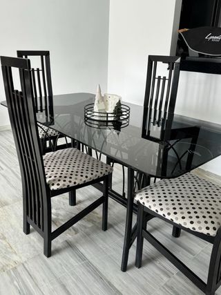 Conjunto de mesa de comedor con superficie de cristal negro y cuatro sillas a juego. - Diseño moderno y elegante. - Patas de madera. - Tapicería de tela con estampado de puntos.