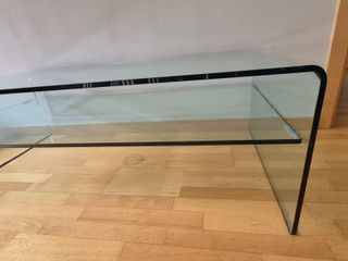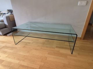 Elegante mesa de centro rectangular de diseño curvo. - Fabricada en vidrio. - Marca FIAM Italia. - Dimensiones mesa: 130 x 67.5 x 43 cm - Dimensiones bandeja inferior: 127 x 66 x 1.2 cm
