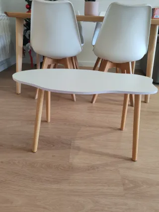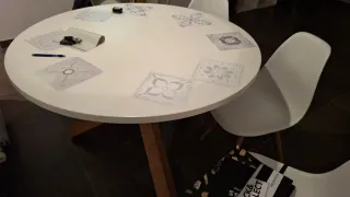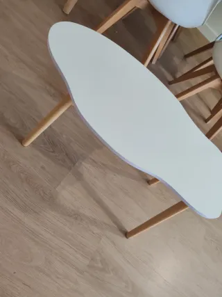 Conjunto de mesa y sillas. - Mesa con superficie blanca. - Sillas de diseño moderno. - Cada silla cuesta 20€. - Cada mesa cuesta 25€ Disponibles, en excelente estado.