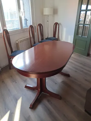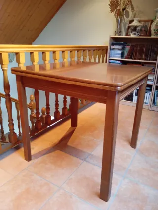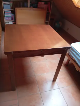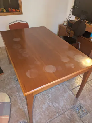 Mesa de comedor extensible (2m de largo). Está bastante envejecida, con varios desperfectos pero parece de buena calidad