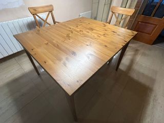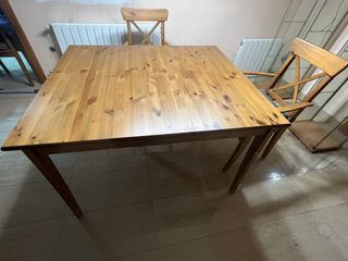 Mesa de comedor modelo LAURILA de IKEA de madera. Su diseño rústico y robusto la hace ideal para cualquier hogar. - Fabricada en madera maciza. - Acabado natural. Mesa de comedor IKEA LAURILA Medidas: 100 x 120 cm, altura 75 cm. Fabricación: Made in Finland, año 1999 (ver foto de la etiqueta). Estado: buen estado general, mesa sólida y estable; señales normales de uso en el tablero (ver fotos). Ideal para comedor o cocina amplia (4–6 personas). Recogida en mano (voluminosa).