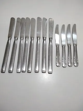 Conjunto de doce cuchillos de mesa de acero inoxidable.Son 8 cuchillos grandes y 4 pequeños de postre.En buen estado. - Diseño elegante y funcional. - Acabado plateado brillante. - Materiales de alta calidad para mayor durabilidad.
