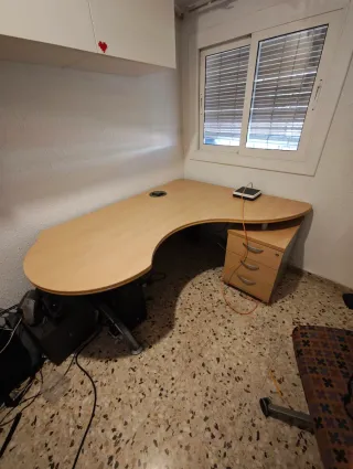 Mesa de escritorio esquinera de madera y metal. Con cajonera. - Medidas del tablero 180cmx140cm. - Tablero de madera en tono claro. - Estructura de metal resistente. - Cajonera integrada con tres cajones. - Hueco para pasar cables. Se vende desmontada y a pie de calle.