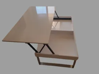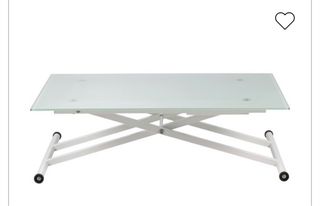 Mesa de centro con diseño moderno y funcional. Su superficie se eleva para adaptarse a diferentes usos. - Acabado en color beige y blanco. - Estructura metálica y de madera. - Superficie de cristal.