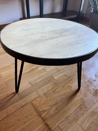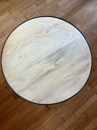 Mesa auxiliar con un diseño moderno que combina hierro y madera. - Base y estructura de hierro. - Tablero de madera con veta marcada. Diámetro 48,5