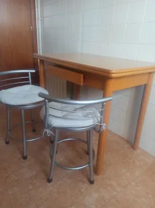 mesa extensible con un cajón ideal para cocina con dos sillas. Muy practico para desayunos o como mesa auxiliar. - Mesa de madera clara Cerrada:100x59. Abierta mide 160x59 - Taburetes con respaldo de estructura metálica y madera. Los dos cojines son de Ikea. Los regalo con los taburetes.