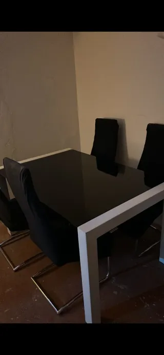 Elegante mesa de comedor con un diseño contemporáneo que combina materiales de calidad. - Superficie superior en cristal negro. - Base y extensiones en acabado gris. - Patas de hierro en blanco Se regala cuatro sillas