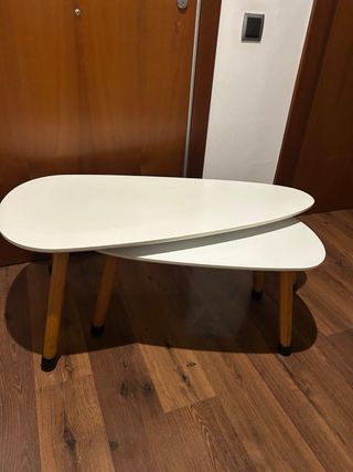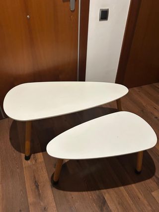 Conjunto de dos mesas auxiliares con un diseño moderno y orgánico. - Tableros de color blanco. - Patas de madera.