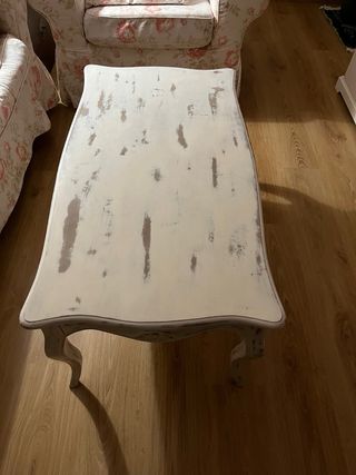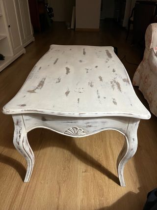 Elegante mesa de centro con un acabado decapado que le da un toque vintage. - Diseño curvo y patas ornamentadas. - Detalles tallados en la parte inferior.