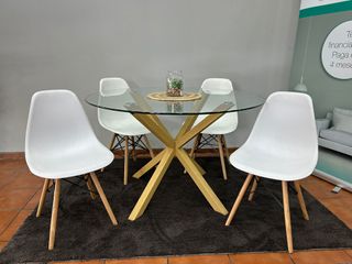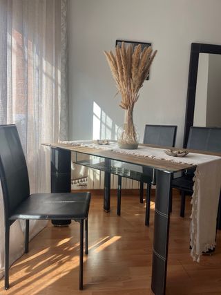 Conjunto de mesa de comedor con cuatro sillas. - Mesa con superficie de cristal (vinelada) - Sillas de color negro