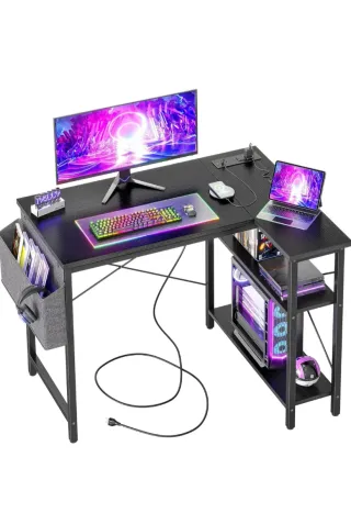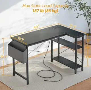 Mesa de esquina BERXEVUE con diseño en L. Ideal para optimizar el espacio. - Estructura de metal resistente. - Superficie de madera. - Incluye organizador lateral de tela. - Estantería integrada para almacenamiento.
