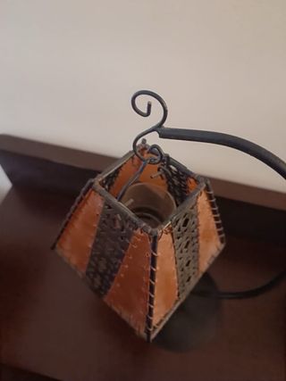 Elegante lámpara de mesa con un diseño único. - Base y estructura de metal. - Pantalla de cuero con detalles calados. - Adorno en espiral en la base.