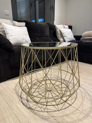 Elegante mesa auxiliar con un diseño moderno y llamativo. - Estructura metálica con acabado dorado. - Tapa redonda de cristal. - Base con diseño geométrico.