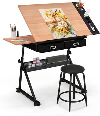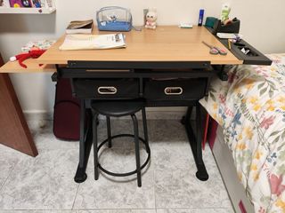 Mesa de dibujo con superficie de madera y estructura metálica. - Superficie de madera. - Estructura metálica. - Cajones de tela. - Taburete incluido.