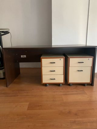 Conjunto de muebles de oficina que incluye una mesa y dos archivadores. - Mesa de oficina espaciosa. - Dos archivadores con ruedas. - Diseño moderno y funcional.
