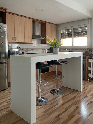 Mesa alta de comedor con un diseño moderno y funcional, perfecta tanto para pisos pequeños como grandes. En perfectas condiciones. - Estilo isla. - Acabado en blanco. - Fabricada en madera. - Se incluyen o venden por separado las sillas por 85€ adicionales. -Fabricada en Italia -Precio actual en la web de MobiliFiver 406€